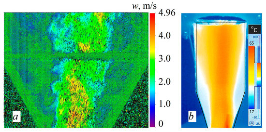 Before conducting the research, a qualitative and quantitative comparison of the thermograms of the flow distribution in the VCD was carried out with the results of other authors (Figure 4) and data obtained using the PIV (Particle Image Velocimetry) method (Figure 5).