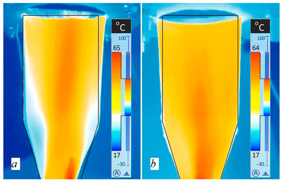 Thermograms of the flow structure in the VCD for a nozzle supply with a base of 32 mm for different air flow rates are shown in Figure 8 and Figure 9. First, data for the average air consumption through the system, q = 0.034 m3/s, are presented (Figure 8). Figure 8a shows that installing the nozzles at a 45° angle results in the formation of a pronounced central flow in the diffuser along the axis at 75% of its height. At the same time, almost imperceptible stagnation zones are observed at the corners of the transition from the conical to the cylindrical section; low-intensity flow occurs in the remaining volume of the diffuser.