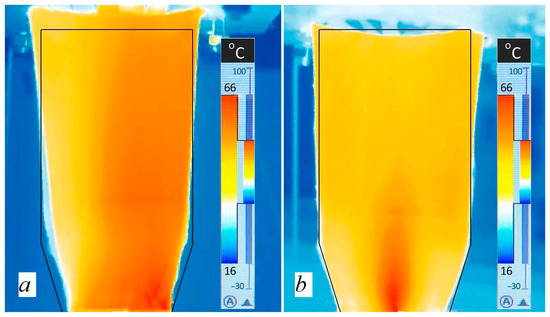 Thermograms of air flow distribution in a VCD for different conditions: (a)—supply through a single duct (32 mm) and q = 0.0047 m3/s; (b)—supply through nozzles at an angle of 45 with a base of 32 mm and q = 0.0047 m3/s.