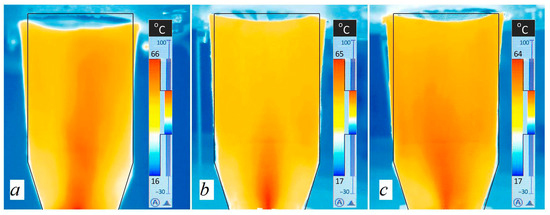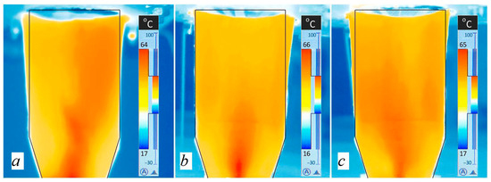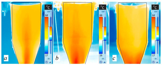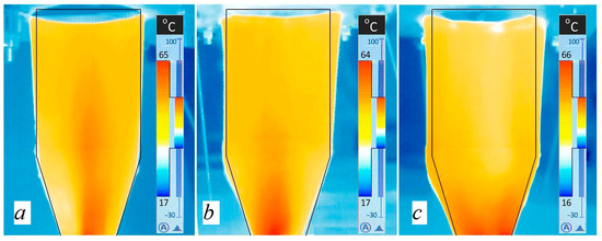 Thermograms of the flow structure in a VCD with a base diameter of 32 mm for q = 0.0057 m3/s and for air supply through nozzles at different angles: (a)—45°; (b)—60°; (c)—70°.