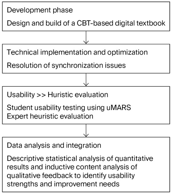 This study was designed as a multi-method usability evaluation, combining user testing and expert review methods, to assess the usability of a CBT-based DT applying Unreal Engine-based Metahuman techniques for nursing education and identify improvement needs. This combined approach is grounded in prior research results showing that the complementary involvement of users and experts allows for a holistic understanding of both learners’ experiences and underlying design flaws in a system [15]. The usability evaluation of this study adopts a multi-method framework informed by Silva et al. [16] and Cho et al. [17], who emphasize combining user testing and heuristic inspection to comprehensively assess digital tools. In line with their approach, we conducted parallel evaluations: student usability testing to measure perceived satisfaction and engagement, and expert heuristic evaluation to uncover structural or interface-level usability issues. This dual-track design strengthens the validity of findings by integrating experiential feedback with expert-based diagnostics. Therefore, this study aims to strengthen both the design quality and learning effectiveness of educational content through a parallel analysis of actual usability data and expert diagnostic results on nursing education DTs. The overall research process is shown in Figure 1.