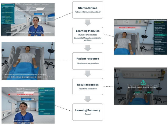 Figure 2 illustrates the sequential learning flow of the developed CBT-based digital textbook integrating Metahuman technology. The program begins with a Patient Handover screen, where learners review essential patient information (demographics, diagnosis, medications, and vital signs) and identify learning objectives. In the Learning Module, learners make clinical decisions through multiple-choice steps following the nursing process. The Patient Response stage presents the Metahuman’s verbal and nonverbal reactions—such as facial expressions, eye gaze, and voice tone—reflecting the learner’s selected interventions. Based on these actions, the Result Feedback screen provides real-time guidance and corrective information, enabling immediate error recognition and self-reflection. Finally, the Learning Summary presents a concise performance report and key learning points for reflection.