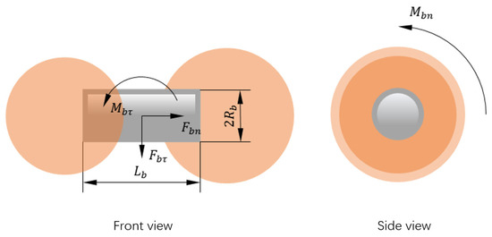 The contact force model selected for straw particles is the Hertz–Mindlin with bonding model. The crushing process involves the gradual reduction in straw particle size, and the Hertz–Mindlin with bonding model is derived from the Hertz–Mindlin (no slip) contact model [23]. Building upon the calculation of fundamental contact forces between particles, it establishes parallel bonding between adjacent particle contact points, forming adhesive bonds that generate forces and moments between particles, as shown in Figure 1. When these adhesive bonds are disrupted by external forces, they do not reconnect. The simulation of fragmentation and fracture phenomena is achieved through the breaking of these adhesive bonds. The forces and moments acting on the adhesive bonds are as follows: