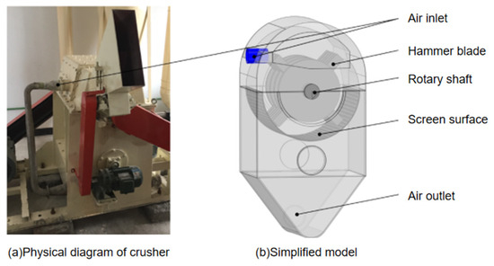 The self-developed comminution apparatus incorporates a dual-tangential air intake configuration at the upper periphery of the pulverization chamber. This counter-rotating airflow design aims to optimize the vortex flow characteristics through shear layer interaction. Geometric simplification was implemented following aerodynamic equivalence analysis, preserving critical flow-governing features while eliminating non-essential structural components to facilitate CFD meshing processes and reduce simulation complexity. The physical prototype configuration (Figure 2a) and its aerodynamically equivalent simplified counterpart (Figure 2b). Crusher component parameters are listed in Table 1.