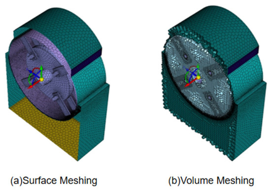 Classification of the extracted fluid domain into dynamic and static domains. The dynamic domain corresponds to the cylindrical region swept by the rotor’s rotational motion. This cylindrical domain was constructed by aligning its central axis with the rotor’s rotational axis. A Boolean subtraction operation was then executed between the cylindrical volume and the rotor geometry to isolate the dynamic fluid domain, as depicted in Figure 3b. The resultant dynamic domain strictly adheres to the spatial envelope defined by the rotor’s rotation about its central axis. The static domain model was obtained by performing a Boolean subtraction operation between the global fluid domain and the dynamic subdomain (which encompasses the rotor-swept cylindrical region). This process excluded the rotating components, yielding the stationary fluid volume as illustrated in Figure 3c. Interface surfaces were established between the dynamic and static domains to enforce flow field continuity and facilitate robust data transfer of nodal solutions.