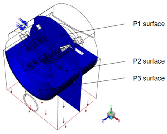 In order to accurately describe the variation in the flow field characteristics in the pulverizing chamber under different rotor speeds and air inlets, three different macroscopic cross-sections were selected according to the working characteristics of the pulverizer. As shown in Figure 5, the P1 cross-section is located at the Z = 178.79 mm plane to observe and analyze the radial flow along the rotor; the P2 cross-section is located at Y = 0 plane to observe and analyze the axial flow along the rotor; the P3 cross-section is located at the inner sieve surface to observe the sieve area flow. These three sections can be more comprehensive expressions of the macroscopic pressure field and the velocity field characteristics of the pulverizing cavity flow field.