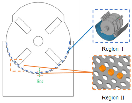 At the same time, in order to deeply study the influence on the screening process under different rotor speeds and air intakes, as shown in Figure 6, macroscopically selected area I (the gap between the hammers and the sieve surface), microscopically selected area II (inside the designated sieve holes), and LINE (4 mm line inside and outside the bottom sieve holes) were used as the objects of the study.