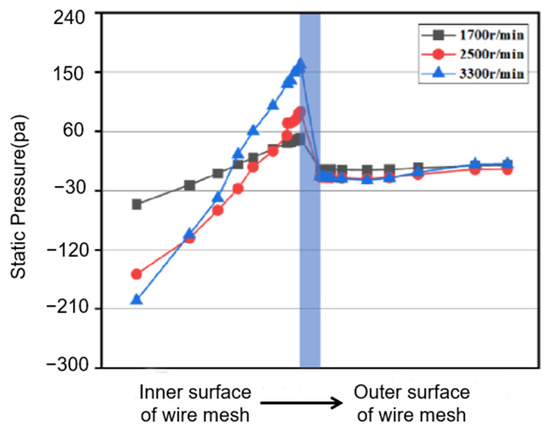 Variation in static pressure inside and outside the screen surface at different rotor speeds.