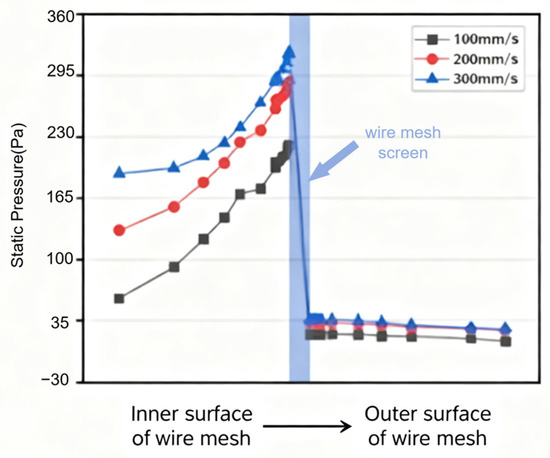 Figure 7 shows the static pressure variation curves along the inner and outer sides of the rotor radial sieve surface (without passing through the sieve holes) at three rotor speeds without an applied wind field, and the blue area is the location of the sieve surface.