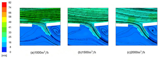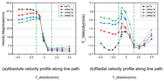 The velocity field in Region I (reference zone) was analyzed, with Figure 9 illustrating the velocity vector distributions under three rotor speeds. A subset of airflow exhibited reverse flow toward the rotor center due to the rotor’s fan effect. The measured reverse flow velocities were as follows: 1700 rpm (151.8 rad/s): 5.23–7.65 m/s, 2500 rpm (261.8 rad/s): 6.11–9.58 m/s, 3300 rpm (345.6 rad/s): 12.17–15.43 m/s.