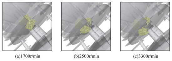 Figure 8 shows the velocity cloud of the P1 plane at three rotor speeds. In the rotor sweep area, the minimum airflow velocity appears at the surface of the rotor shaft, along the radial direction of the rotor; the airflow velocity gradually increases, the maximum airflow velocity is found at the edge of the end of the hammer blade, and the airflow velocity gradually decreases from the end of the hammer blade to the inner surface of the screen surface. With the increase in rotor speed, the maximum value of airflow velocity in the P1 plane increases, and the maximum values of airflow velocity at the three rotor speeds are 56.71 m/s, 82.30 m/s, and 109.43 m/s, respectively.