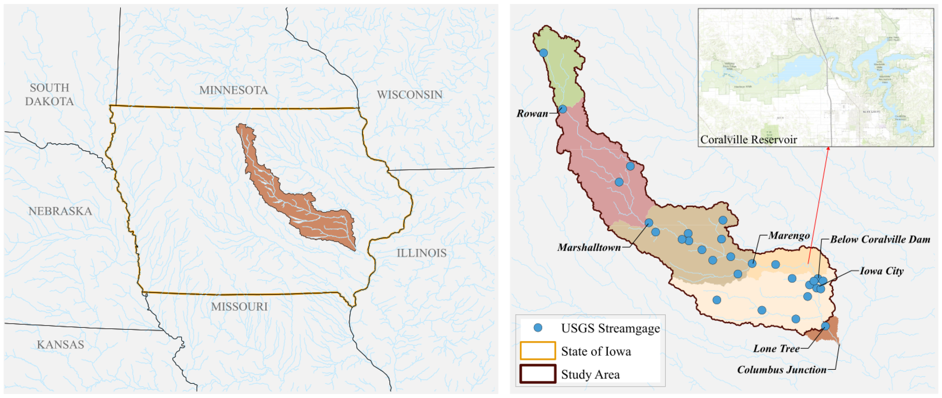 - U.S. Army Corps of Engineers, Rock Island District. Coralville Lake Water Control Plan Update Report with Integrated Environmental Assessment; U.S. Army Corps of Engineers: Rock Island, IL, USA, 2022. [Google Scholar]