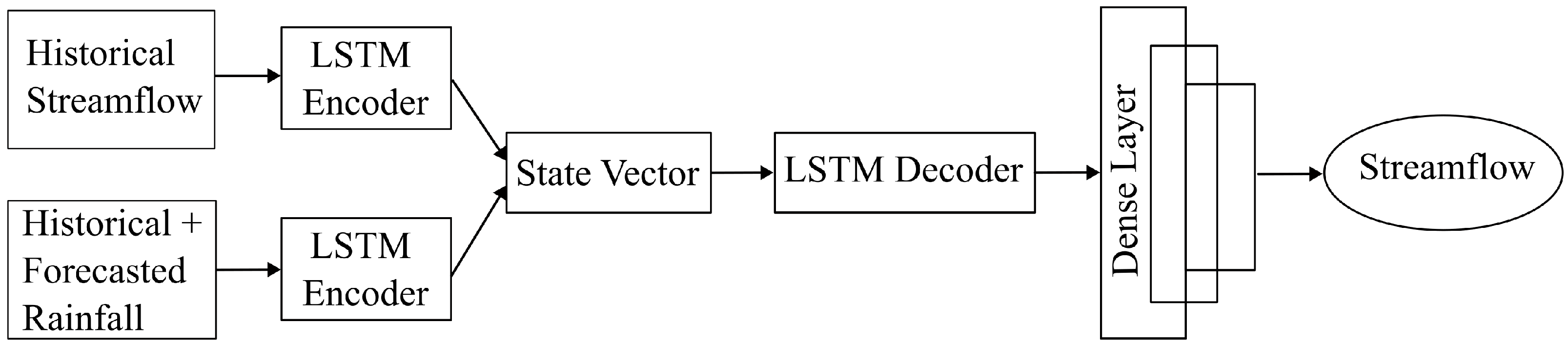 - Xiang, Z.; Yan, J.; Demir, I. A rainfall-runoff model with LSTM-based sequence-to-sequence learning. Water Resour. Res. 2020, 56, e2019WR025326. [Google Scholar] [CrossRef]