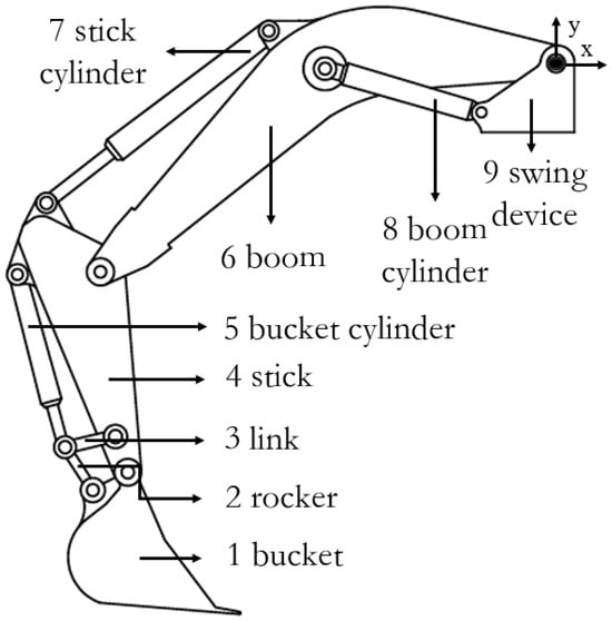The excavator working device is typically composed of the following components, which are articulated together: (1) bucket, (2) rocker, (3) link, (4) stick, (5) bucket cylinder, (6) boom, (7) stick cylinder, (8) boom cylinder, and (9) swing device, as shown in Figure 1. Among these, the stick (4) and the boom (6) are the primary load-bearing components. Their main function is to extend the digging radius of the bucket, enabling it to accomplish long-range excavation tasks. Moreover, since the structural performance of the stick directly influences the overall operational reliability and stability of the excavator, it is essential to investigate its mechanical properties.
