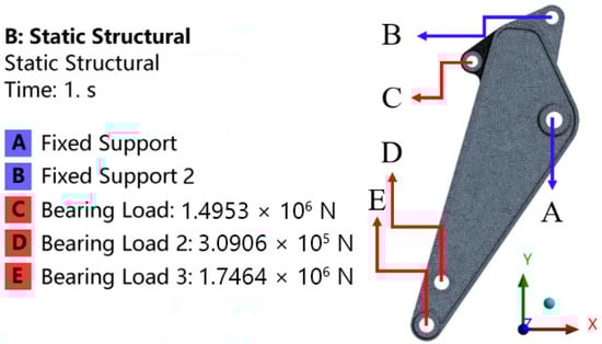 For the excavator stick, its spatial position at any given moment during operation is unique and determined. Therefore, hinge points A and B were fully constrained. The compound excavation working condition was selected for the analysis of the stick, which is the most hazardous condition in the excavation process [,]. Based on the compound working conditions, the force boundary conditions at the hinge points of the stick were applied, with FCx = 511 KN, FCy = 1405 KN, FDx = −132 KN, FDy = 279 KN, FEx = −694 KN, and FEy = −1602 KN. The calculation formulas for the forces at hinge points C, D, and E are referenced from []. The force results at each hinge point are presented in Table 3.
