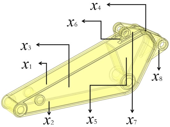 To construct a BPNN agent model, it is necessary to obtain a training sample dataset that adequately reflects the design characteristics. Central composite design (CCD) is a commonly used response surface methodology for experimental design, suitable for generating test sample points with multiple parameters and levels []. To achieve global optimization of the structural performance of the excavator’s boom, eight relatively important design parameters and their optimization ranges were identified [,,,]. The selection of design parameters is illustrated in Figure 5, and their values are presented in Table 4.