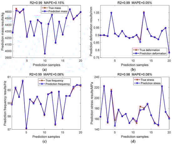 After the BPNN was trained on 141 sets of test sample datasets on the structural design parameters and structural performance (mass, deformation, first-order frequency, and stress) of the bucket bar, the mapping relationships between the structural design parameters and the structural performance were constructed in the inner layer of the neural network structure. In order to objectively evaluate the merits of the mapping performance of the neural network model, the neural network prediction results of the 20 sets of sample test sets were evaluated using the mean absolute percentage error (MAPE) and the goodness-of-fit R2.