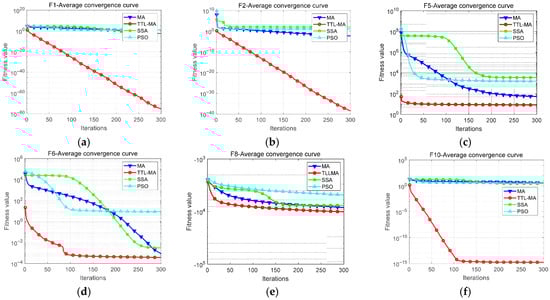 The comparative performance of optimization algorithms was evaluated through convergence curve analysis, quantifying both convergence rate and solution accuracy. Figure 8 presents the averaged convergence characteristics from 30 independent runs, demonstrating that the proposed TTL-MA consistently achieved significantly faster convergence and higher precision in optimal fitness value localization compared to the baseline MA, PSO, and SSA across all six test functions, thereby validating the algorithmic enhancements.