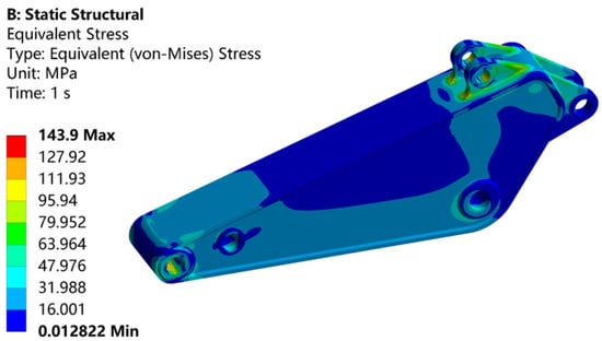The optimization results of the stick design parameters are presented in Table 10. The results demonstrate the following: the optimized stick mass is 4088.2 kg, representing a 7.9% reduction compared to the initial mass of 4440.2 kg and the maximum equivalent stress of the optimized stick is 143.9 MPa, showing an 11.9% decrease from the initial value of 163.34 MPa. Figure 11 illustrates the equivalent stress contour of the optimized stick structure. The discrepancy between the actual mass of the excavator stick (4088.2 kg) and the algorithm-optimized mass (4064.51 kg) is primarily attributed to minor errors in the structural mass agent model, combined with the rounding of the stick’s design parameters to integer values for mechanical manufacturability.