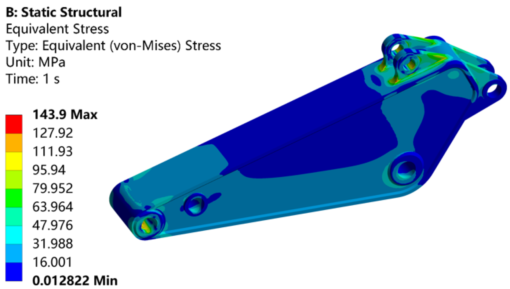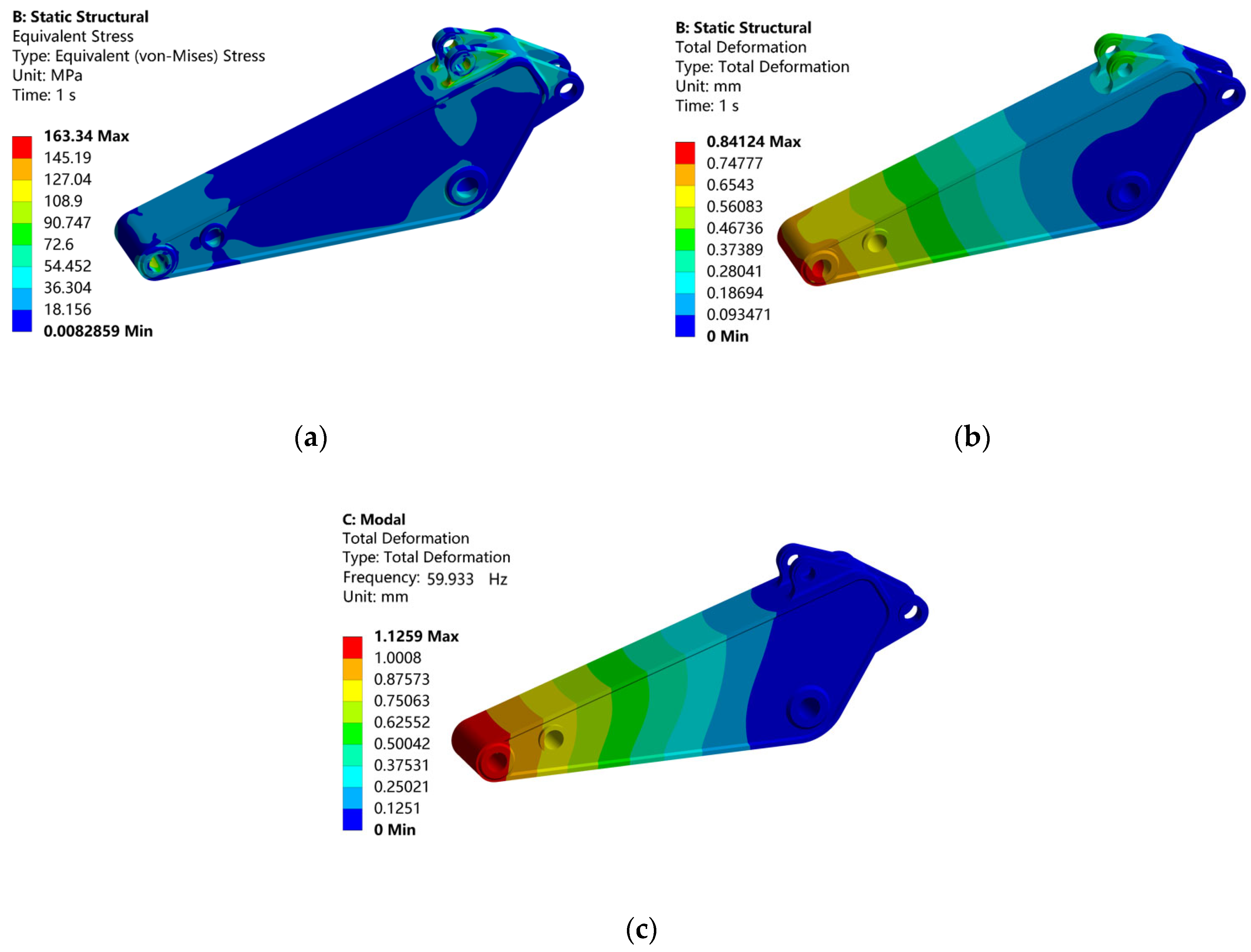 - Qin, Z.; Mo, X.; Wu, Y. Finite Element Analysis and Structure Optimization of Hydraulic Excavator Working Device Based on ANSYS Workbench. Coal Mine Mach. 2024, 43, 120–123. [Google Scholar]