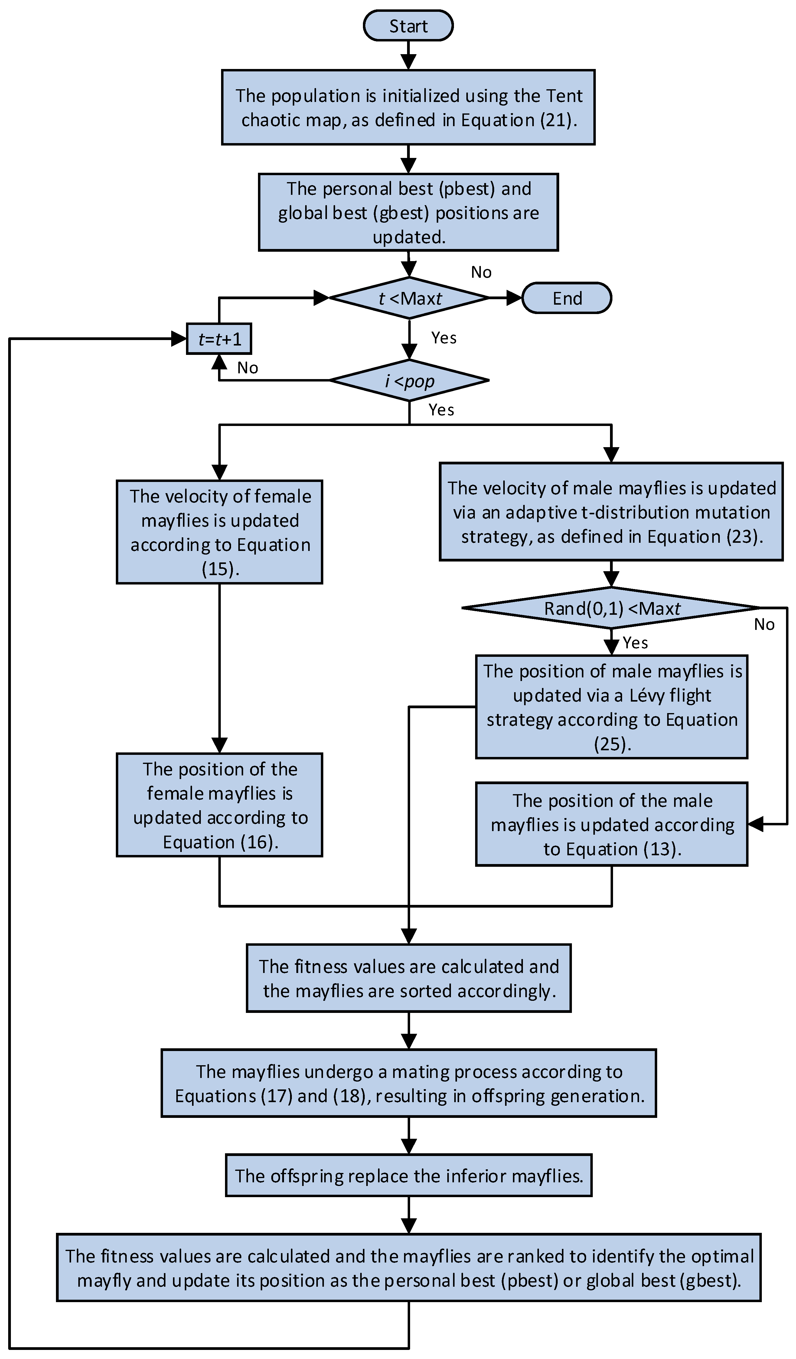 4.5. Improved Mayfly Optimization Algorithm (TTL-MA) Iteration Flow