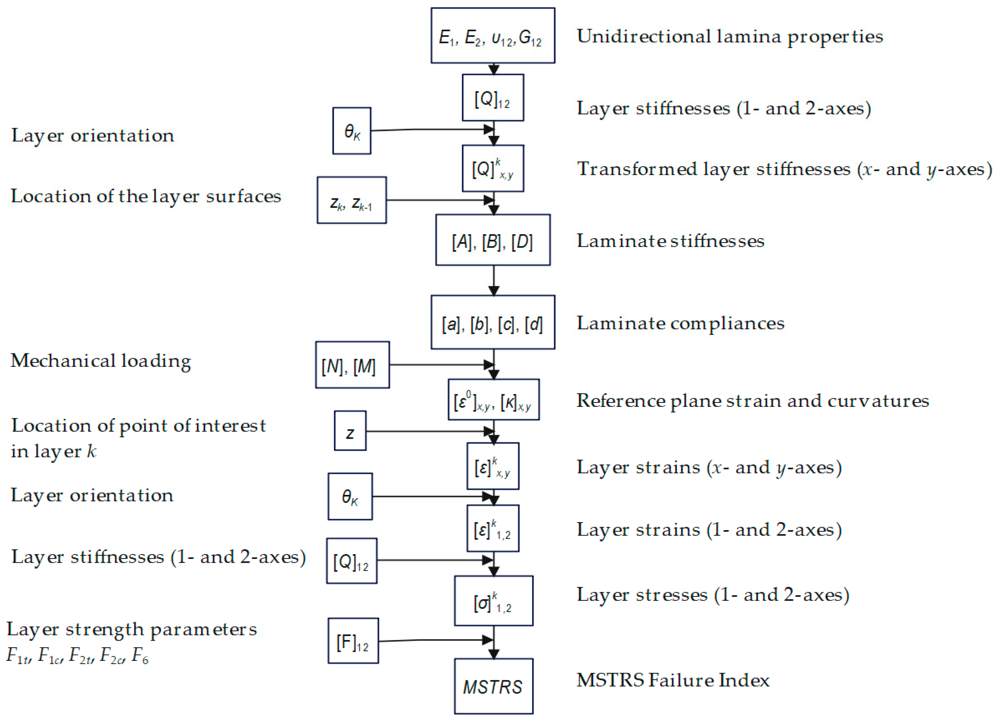 The procedure for determining the failure index using the Maximum Stress Criterion begins with the preparation of input data. This includes the basic lamina properties such as the longitudinal modulus (E1), transverse modulus (E2), Poisson’s ratio (ν12), and in-plane shear modulus (G12). Additionally, the laminate stacking sequence must be defined, including the orientation angles of each ply relative to the reference direction, along with the thickness of each ply. External loading conditions are also required in the form of in-plane forces (Nₓ, Nᵧ) and moments (Mₓ, Mᵧ).