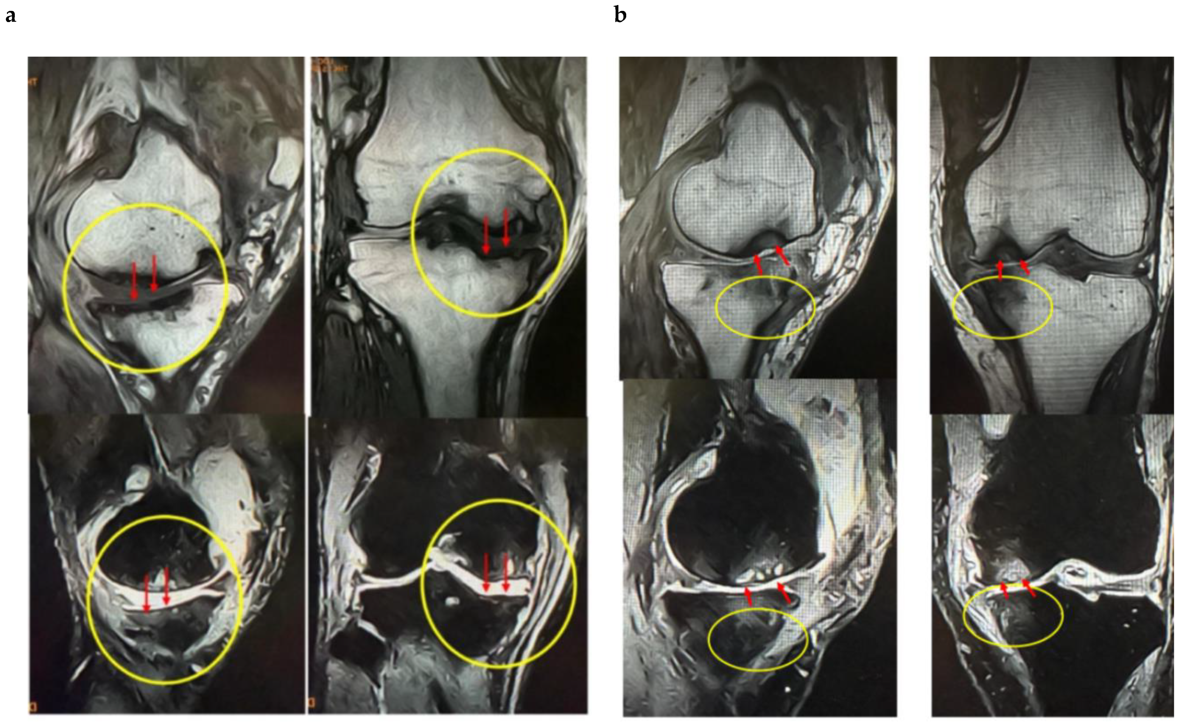 Figure 6b (case 2) underwent a total of 50 ESWT sessions (once per month) from 2019. The left image shows the coronal MRI before treatment, and the right image shows the MRI after 5 years of therapy. Although bone sclerosis was evident before treatment, the long-term images demonstrated improvement of sclerosis and a clear thickening of the articular cartilage layer, as indicated by the yellow arrows. These findings suggest that long-term ESWT may contribute to cartilage protection and regeneration.
