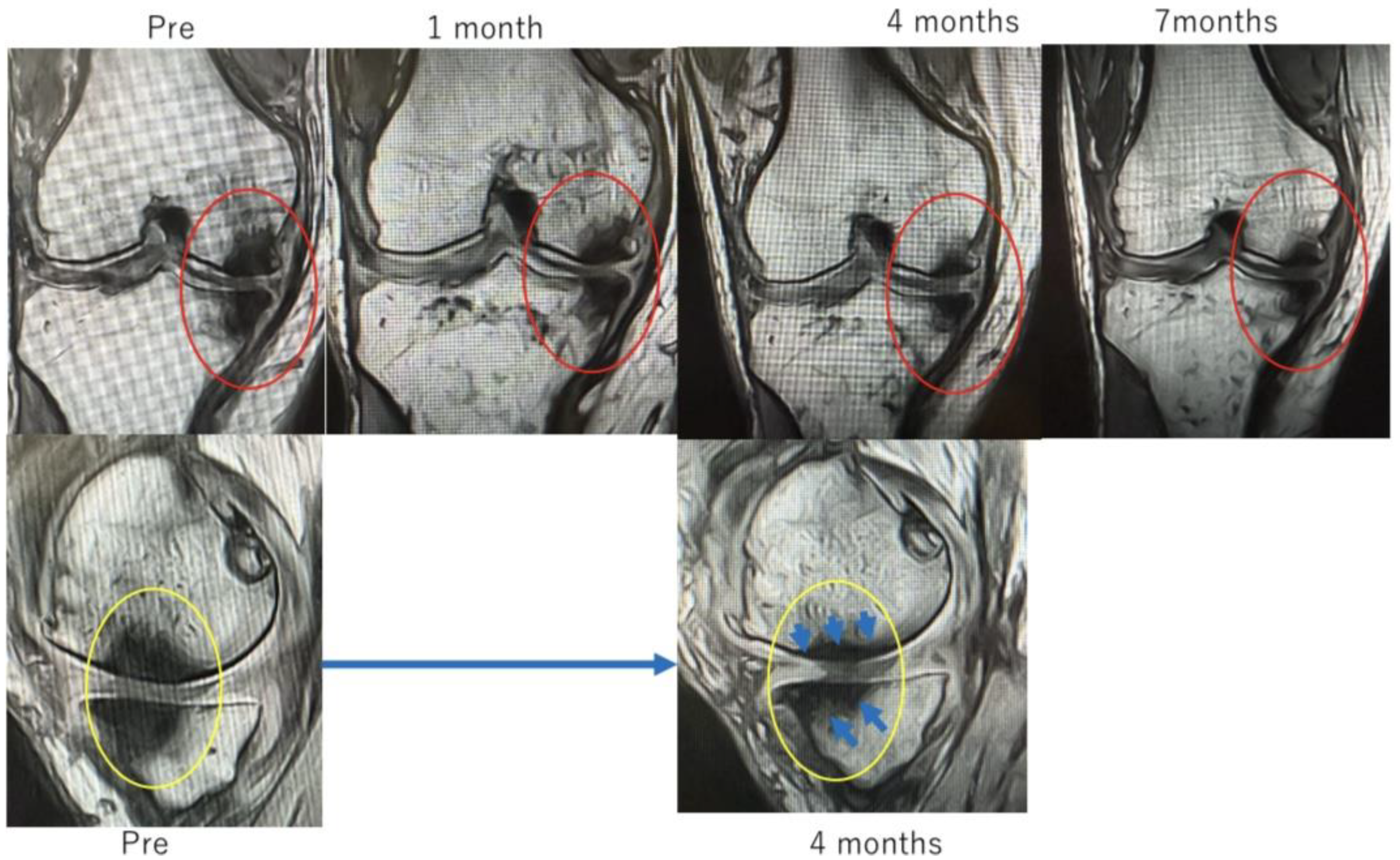 Figure 8), a 70-year-old male, at baseline, MRI revealed the disappearance of the cartilage layer and SBP tear associated with a BML in the medial femoral condyle and tibial plateau. At 1-month post-treatment, mosaic-like high-signal areas extended throughout the region surrounding the BML. At 4 months, the mosaic-like areas and a reduction in BML were observed. At 7 months, although no improvement in the cartilage layer was detected, areas of bone sclerosis had expanded to cover the joint surface, indicating progression of bone repair. It was considered that the repair process was still in progress.