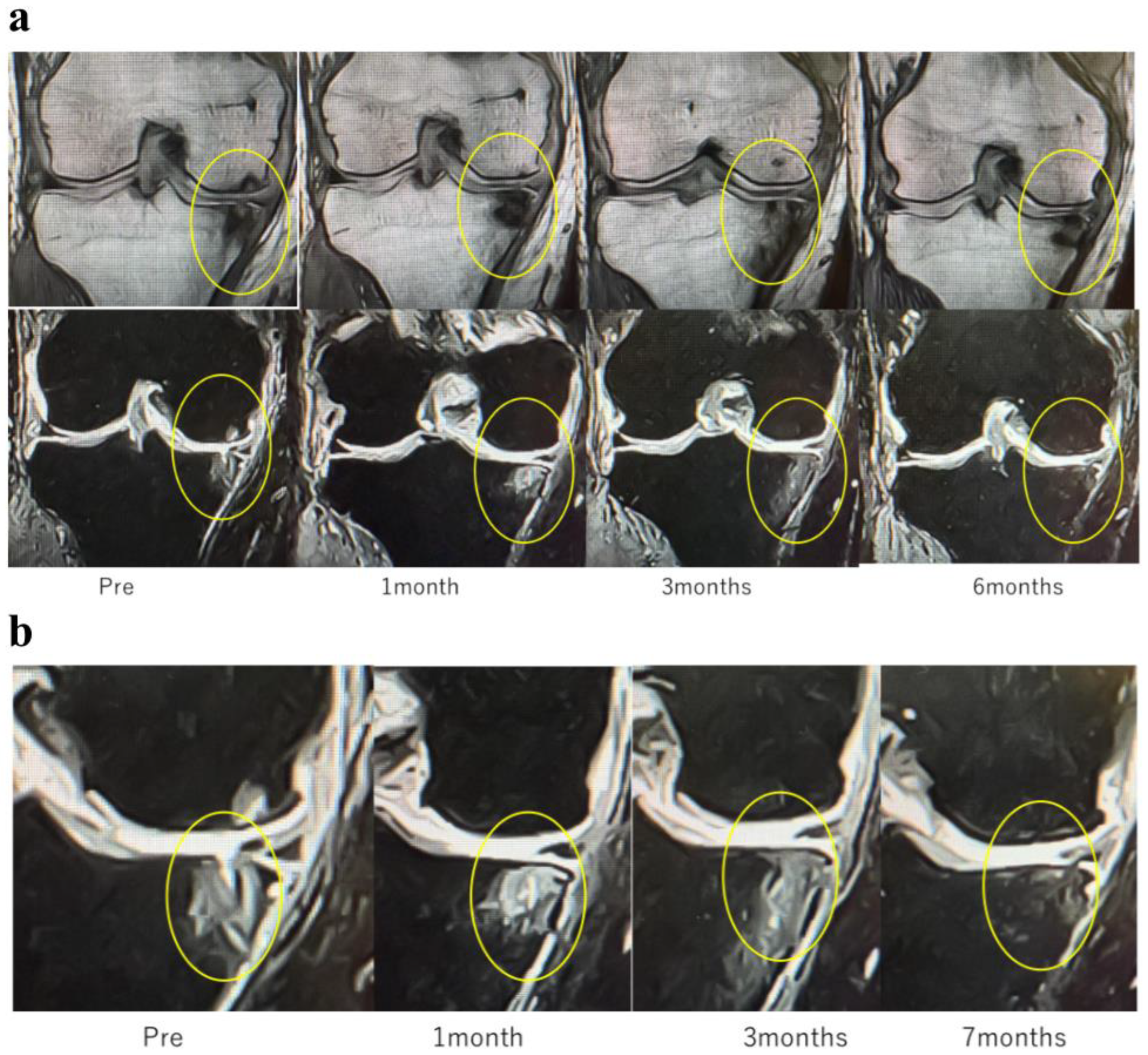 Figure 6a (case 1) shows sagittal MRI images of the knee before and 1 year after treatment with ESWT. A large BML was evident before treatment. After 13 ESWT sessions over 1 year, the BML area was markedly reduced. In addition, the previously torn SBP appeared repaired, and the thickness of the articular cartilage layer increased. These findings suggest that ESWT may exert structural improvements in the subchondral bone and the articular cartilage.