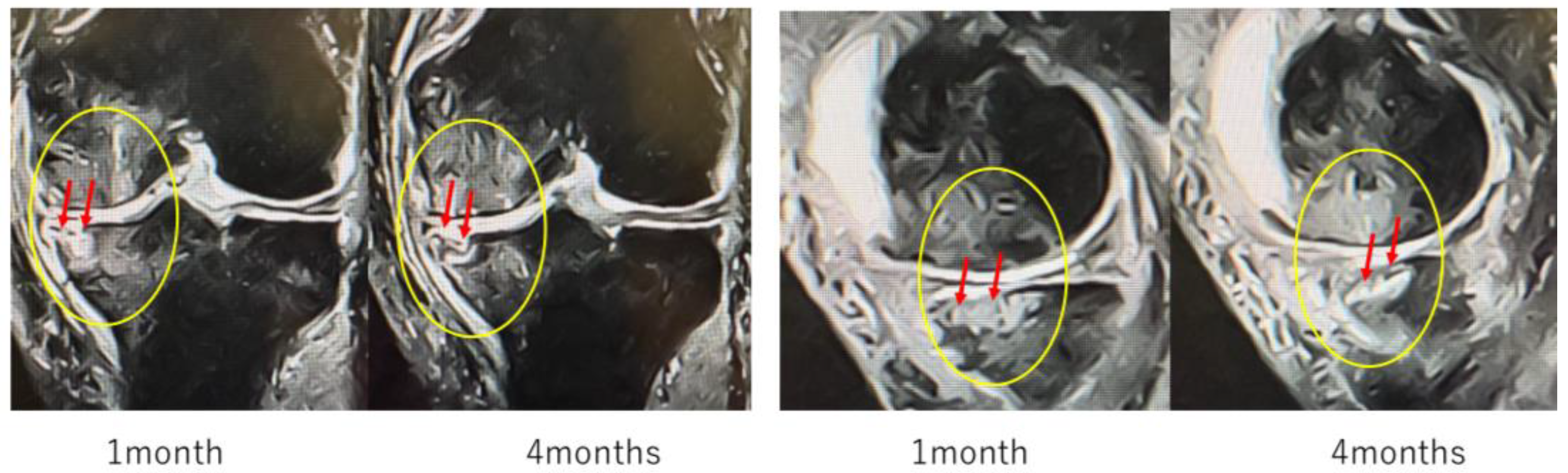 Figure 10 (Case 5) shows T2-weighted MRI findings at 1 and 4 months after intraosseous MSC administration. In sagittal and coronal views, progressive subchondral bone collapse and depression of the articular surface were observed, which became more pronounced between 1 and 4 months. These morphological changes were accompanied by alterations in joint congruity, suggesting ongoing structural compromise that may predispose to secondary osteoarthritic changes.