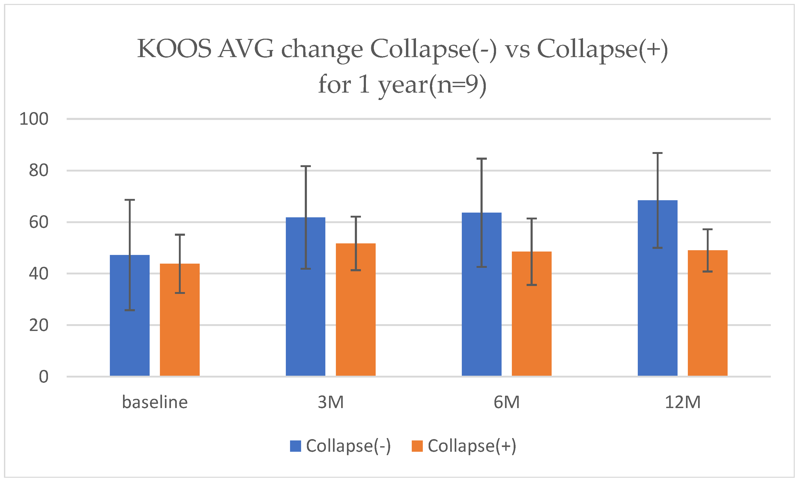 In the joint surface collapse present group (n = 6), the KOOS improved from 58.2 ± 11.6 at pretreatment to 59.4 ± 15.7 (IV, pre-3M = 1.3 ± 7.2) at 3 months, with no significant difference observed.