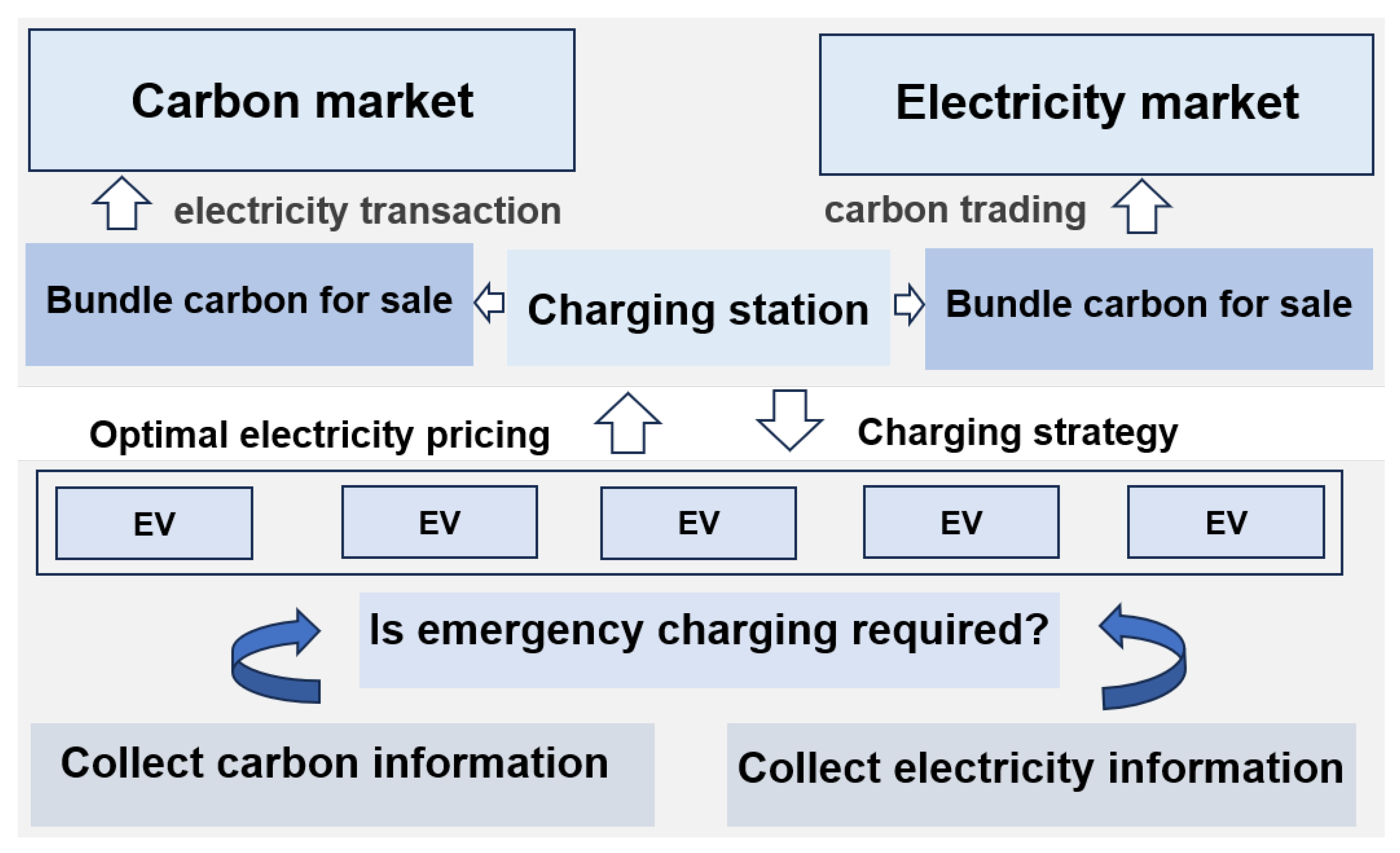 In this paper, a cross-market trading mechanism is proposed to enable the EV participation in the coupled electricity–carbon markets. Considering the emergency charging demand of EVs, an electricity–carbon joint market pricing incentive mechanism is then established. A Stackelberg game model between the CSs and EVs is further constructed such that the optimal electricity price in the joint market for EVs is ultimately derived. The main contribution of the paper is summarized as follows: