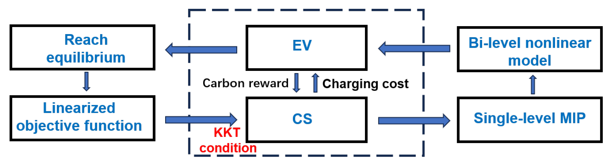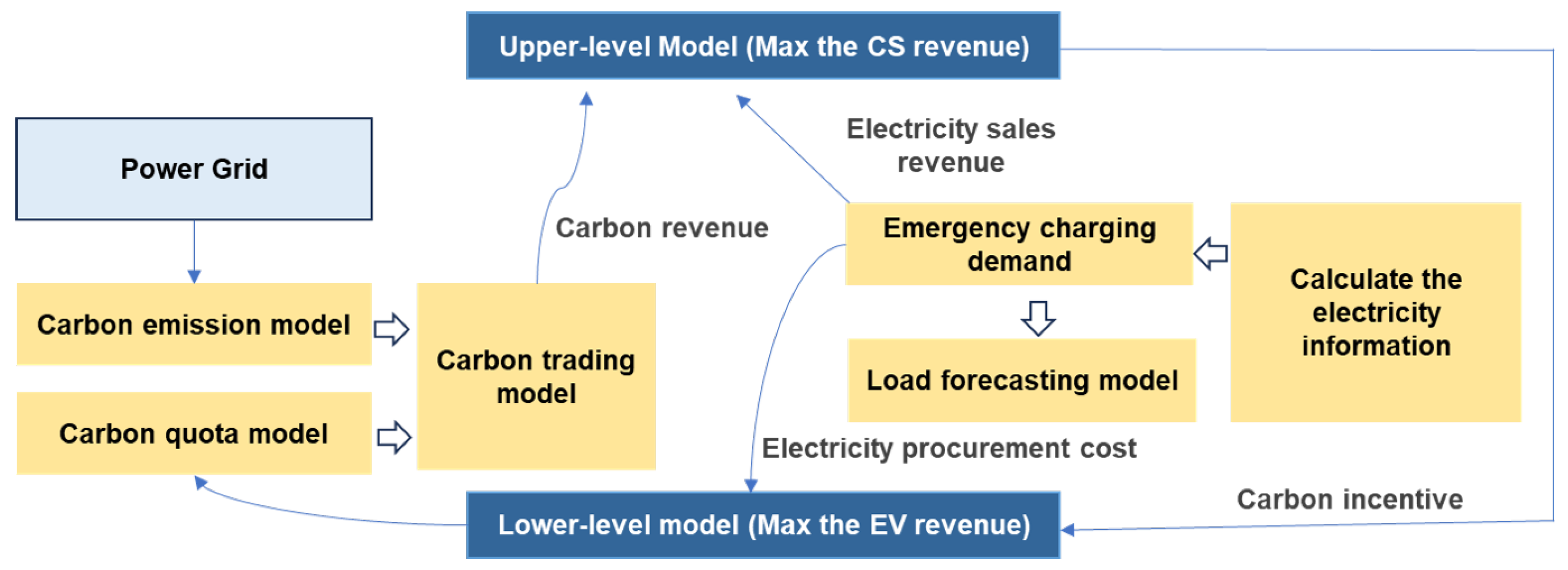 The EV charging model and the carbon trading model are explained in detail, together with the related impact factors. Then, the integrated electricity–carbon market framework is formulated to balance the profits between the CS and EVs in hierarchical optimization.