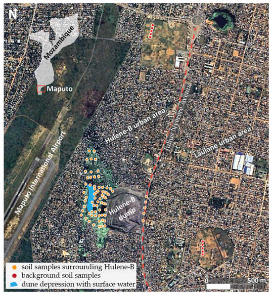 Location of the Hulene-B waste dump and the distribution of sampled soils (orange dots) and background soils (red dots). The study area lies within densely urbanized zones that encompass two major residential communities (Hulene-B and Laulane urban areas) and the Maputo International Airport.