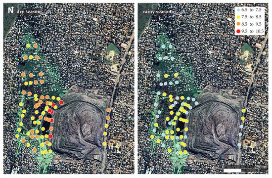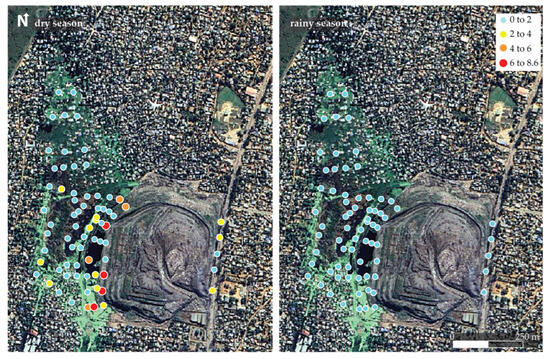 Organic matter content on rainy season soil samples ranged from 0.4 to 1.8%, with an average of 1.0%. Samples collected during the dry season ranged from 1.7 to 8.6%, with a mean of 1.9%. Samples located on the E and W borders of the dumpsite presented OM > 4% (Figure 4). Siddiqi et al. [9] proposed that OM in sandy soil is susceptible to leaching, which explains the relatively lower predominance of OM content during the rainy season. However, high OM content in topsoil may lead to contaminants uptake, as heavy metals bind easily to OM [57], which decreases toxicity levels [58].