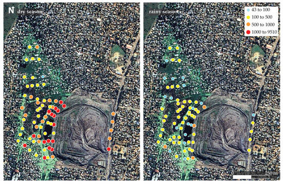 Rainy season soil samples, EC, varied between 43 and 725 µS/cm, with an average of 221 µS/cm, revealing higher values in samples collected near the dumpsite (Figure 3). Samples collected during the dry season presented higher EC than rainy season, ranging from 90 to 9510 µS/cm, and an average of 1150 µS/cm. Spatially, dry season samples presented higher EC values near the dump, suggesting contamination accumulation. Electrical resistivity assays on the study area during the same periods [23] reported higher anomalies in depth during the dry period compared to the rainy period. These differences were associated with the poor superficial leaching occurring during the dry period. Ashraf et al. [54], in a study of soil contamination in the surroundings of a landfill in Pakistan, reported similar results. During dry periods, higher accumulation of heavy metals in the topsoil layer occurred, leading to higher EC and contamination [3,55]. Wu et al. [56] and Naveen et al. [52] suggested that in areas with sources of contamination, such as waste dumps, during dry periods, higher amount of waste transported and deposition of contaminants on the soil surface occur, which are related to higher EC in soils.