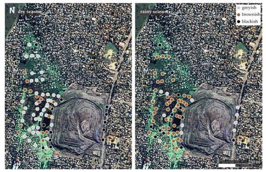 Soil samples’ color from the rainy season was mainly brownish (Figure 5), changing to grayish in dry season samples, and becoming blackish at the immediate limit of the dump. In general, areas with dark and brownish soil colors, near contamination sources such as dumps, have been associated with a greater capacity of the soil to absorb PTES. According to Nisari and Sujatha [58], soils exhibiting darker coloration near waste dumps often contain higher Fe–Mn oxide content, promoting PTE retention. Kanmani and Gandhimathi [59] and Hussein et al. [60] reported that leachate migration from open dumps and landfills leads to the accumulation of organic matter and metal oxides in adjacent soils, resulting in darkened surface horizons and enhanced metal adsorption capacity. Therefore, darker soil colors in areas adjacent to dumps can reflect enhanced potential for PTE absorption and accumulation. Grayish soil color in areas with leachates is associated with leaching processes, consistent with the dry season samples. In the surroundings of dumpsites, color is also influenced by solid waste incineration and ash deposition [61]. Weibel et al. [62] revealed that waste burning contributes to the dispersion of Hg-contaminated ash, which is subsequently deposited in topsoil, causing its enrichment and color variation. In the Hulene-B dump, waste burning occurs daily, with the wind softly transporting the resulting dust into the surrounding areas.