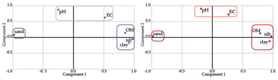 The PCA was performed separately for both seasons, using the variables sand, silt, clay, OM, EC, and pH. For both seasons, two components were extracted, accounting for 82.05% (rainy period) and 83.80% (dry season) of the total variance. The first component (PC1) explained 61.82% (rainy season) and 63.95% (dry season) of total variance, grouping OM, silt, and clay, with sand in opposition (Figure 6). In this study, soil sand was the predominant fraction, being prevalent in samples more distant from the dumpsite. Samples closer to the Hulene-B waste dump showed higher content of OM and thinner fractions, partially related to the incorporation of leachates and ashes resulting from the incineration of solid wastes. The link established between these variables (PC1) can be related to their significance in soil and plant productivity [63], with different types of edible plants being continuously cultivated near the dump [28]. The second component (PC2) explained 17.32% (rainy season) and 19.85% (dry season) of total variance, with positive loadings by pH and EC. This PC can be explained by the lack of significant pH variation, predominantly alkaline conditions, with higher values near the dump. The soil samples’ high pH can be used as an indicator of soil contamination by heavy metals, particularly in tropical areas with a higher significance of Al and Fe oxides. The EC values were predominantly high in all samples, being more significant in samples collected near the dump, with values over the world average EC for sandy soils (<100 µS/cm).