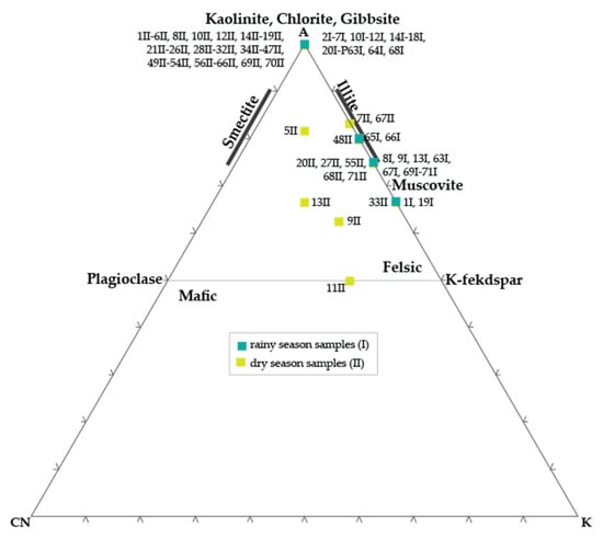Rainy (I) and dry (II) season samples projected in the A–CN–K ternary diagram (Al2O3–(CaO* + Na2O)–K2O). Mineral fields from Obasi et al. [65].