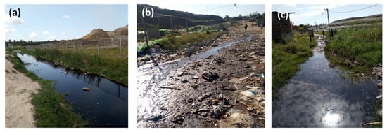 Field images illustrating (a) leachates along the western boundary of the Hulene-B waste dump, (b) leachate seepage at the southern boundary, and (c) adjacent surface water potentially influenced by leachate migration.