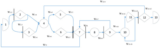 For readers new to GERT (Generalized Evaluation and Review Technique), a step-by-step worked example and executable pseudocode illustrating the reduction in a minimal subnetwork with a parallel implicit-AND (I-AND) join and a feedback loop are provided in the Supplementary Materials. The example follows the same semantics as Section 2.3 (conservative serialized I-AND geometric loop reduction) and reuses the probability and Gamma-duration notation of Section 2.4 to keep symbols consistent.