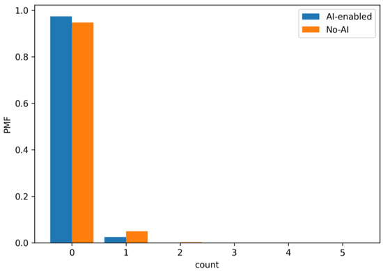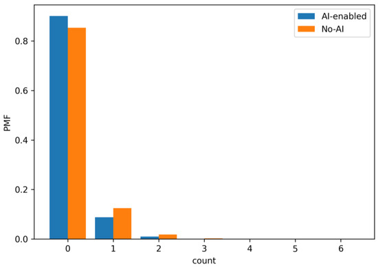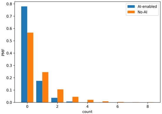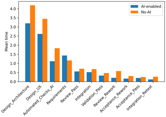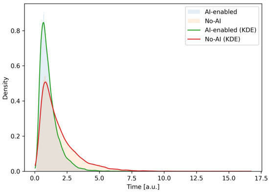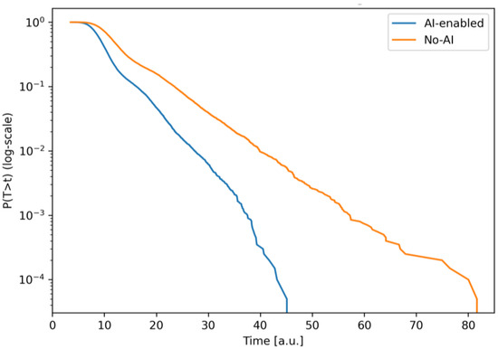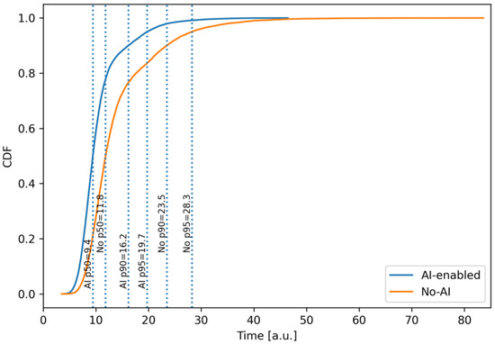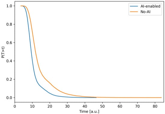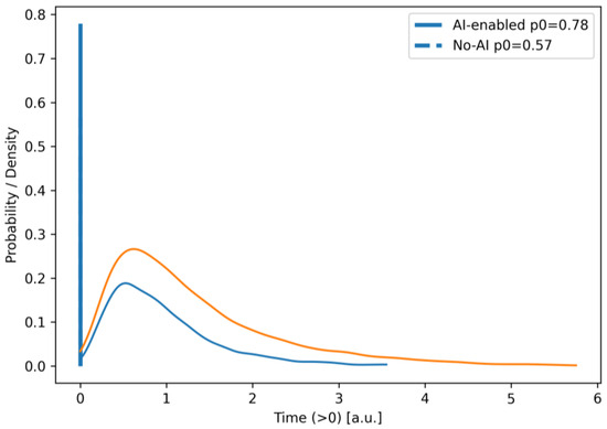 At the final gateway, most increments pass without returning; in the AI scenario configuration, this proportion is higher, p0 = 0.90, compared to the non-AI scenario, p0 = 0.85. If a return occurs (T > 0), the conditional distribution for the AI scenario is shifted to the left and has a shorter “tail”, i.e., corrections last less and are more stable. Visually, the density peak for this scenario is located closer to 1–1.5 CU, while for the non-AI scenario, it is located more to the right, with a more noticeable tail extension to 6–7 CU. The combination of a larger P(T = 0) and a smaller typical duration for T > 0 means a smaller average contribution of the acceptance stage to the total iteration time and further explains the higher probability of meeting deadlines in the AI scenario (see Figure 8).