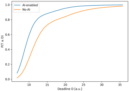 The deadline achievement curves show a higher P(T ≤ D) for any practical D; for example, for service level 0.9, the required deadline in the AI configuration is significantly shorter.
