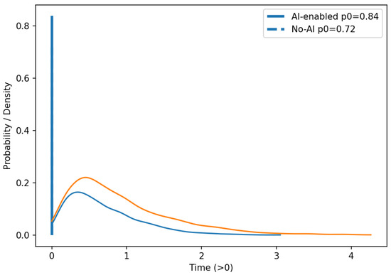 Two-component distribution of acceptance-rework time (arc 124). Vertical sticks at show (AI-enabled p0 = 0.90; No-AI p0 = 0.85). Blue = AI-enabled conditional density ; orange = No-AI conditional density.