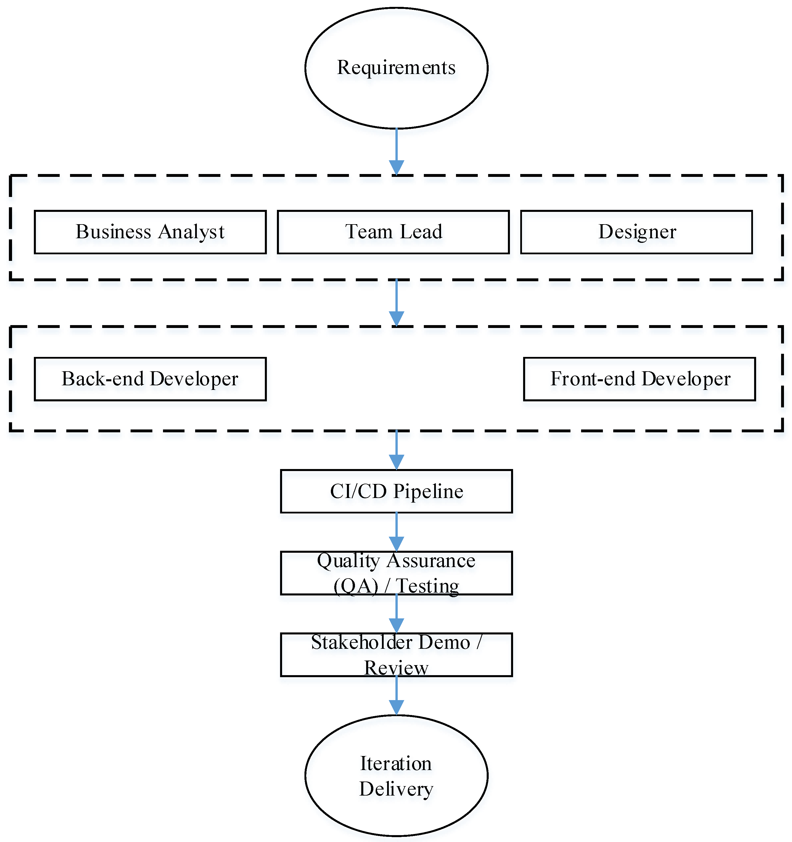 From the perspective of further formalization based on the GERT network, each transition between states is considered as an arc with a probability of successfully passing checkpoints and a duration distribution that reflects the complexity and involvement of roles. The intensity of team participation is naturally interpreted through the “weights” of the arcs: collective reviews (collaborative assessment, peer review) have a higher involvement coefficient than individual actions (for example, deployment or individual automated steps), and the effect of CI/CD and AI tools is manifested in a decrease in the duration parameters and/or the probability of return. Due to this, the updated scheme not only describes the process at the engineering level but also serves as a ready-made basis for quantitative analysis: assessing the expected iteration time, variability, probability of deadline insertion, and sensitivity to the level of automation and the quality of requirements and design artifacts.