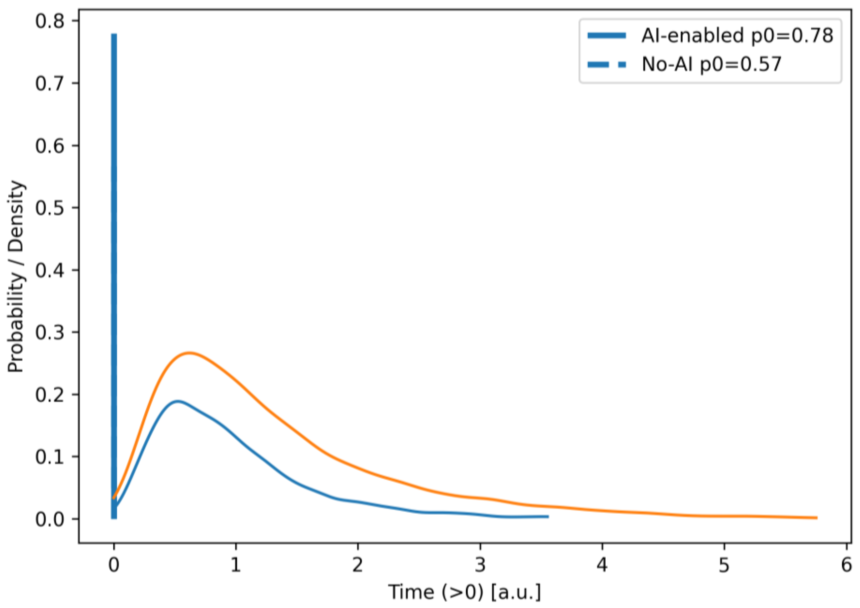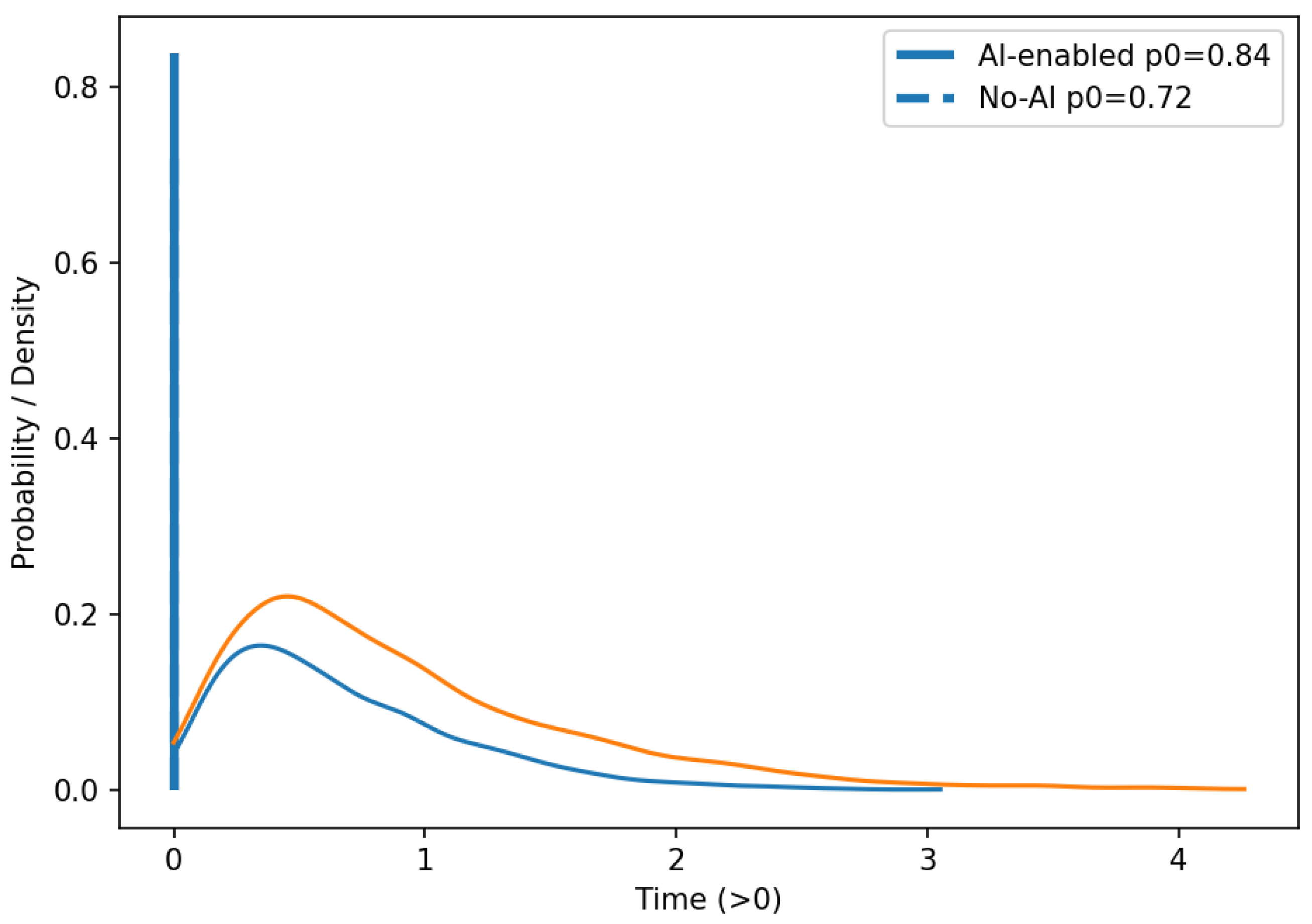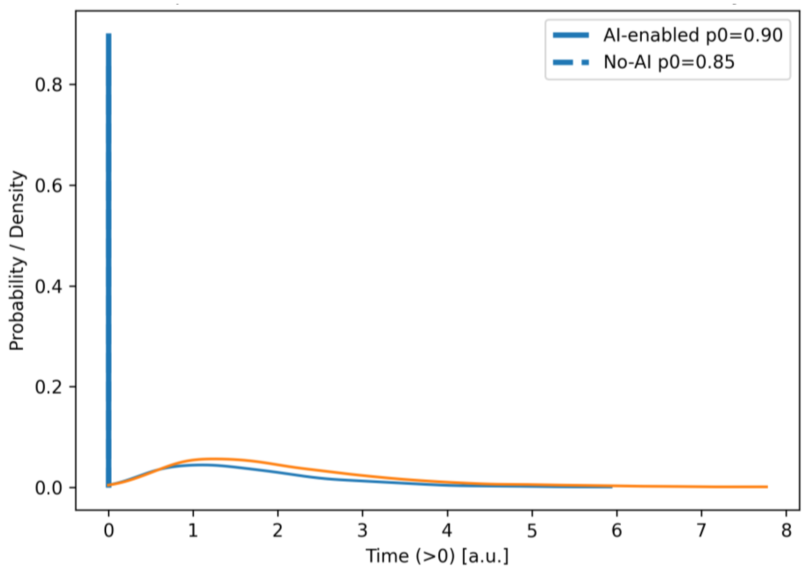 The final interpretation is as follows. Two AI nodes are explicitly built into the process topology—node 3 (AI Requirements Assistant) as an optional branch of early requirements formalization (driven by the decision in node 2 and leading to W34, and node 8 (AI static analysis as part of automatic checks) as a mandatory operational stage before the review. The remaining nodes and arcs retain the basic semantics of the engineering circuit. The probabilities pij in the decision nodes are normalized to 1 (in particular, p23 + p24 = 1, p9−10 + p9−7 = 1, p11−12 + p11−10 = 1, p12−13 + p12−4 = 1), and the distributions Tij are set according to the practical data of the project. This description format makes the role of AI transparent. In this case, nodes 3 and 8 affect both the probability of reaching node 13 and the expected iteration duration.