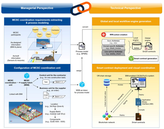 From the managerial perspective, MCSC coordination requirements extraction and process modeling are the entrance points. The MCSC process encompasses complex tasks and many participants, including the client, contractors, designers, and suppliers. Process splitting and subprocess modeling can be performed to simplify highly complex processes. Because the initiation of tasks in the MCSC process is affected not only by the participants but also by as-designed and as-built information, process modeling and automation can be conducted by combining BIM and IoT applications. Another essential procedure from the managerial perspective is to configure the MCSC coordination unit, i.e., the MCSC supply batch (MSB). In the MCSC process model, MSB functions as a token, representing a package that is sequentially passed through the subsequent stages of the process. From the technical perspective, the first essential procedure is used to generate the global and local workflow engines, i.e., blockchain-enabled smart contracts and RPA actions. Then, the deployment of smart contracts with RPA actions, along with their integration into a BIM-enabled visual coordination environment, enables the realization of the application.