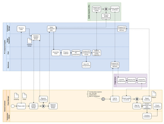 In this process model, all essential schedules and quality control gateways are set, and the information flow among the contractor, precast component supplier, logistics service provider, and quality inspection unit are modeled.