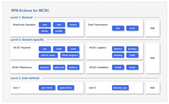 To conform to the context of MCSC, RPA actions are defined in three levels: general (basic level for general purpose), domain-specific (e.g., logistics, payment, warehouse, and construction), and user-defined (customized level under the requirements of a specific user), as shown in Figure 6.
