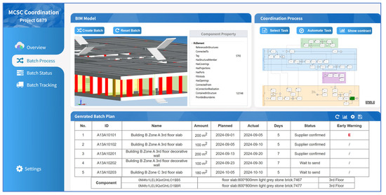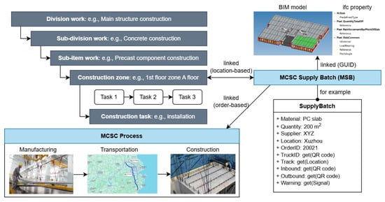 MCSC Supply Batch (MSB) is defined as the smallest element within the coordination framework, which helps facilitate interactions and processes across different stages and parties in the supply chain, as shown in Figure 7. The attributes of MSB can be generated from predefined templates and integrated IFC (Industry Foundation Classes) properties from the BIM model.